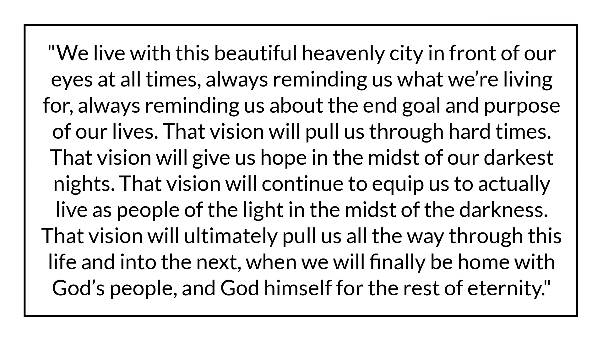 This is how we live in the midst of exile. We live with this beautiful heavenly city in front of our eyes at all times, always reminding us what we’re living for, always reminding us about the end goal and purpose of our lives. That vision will pull us through hard times. That vision will give us hope in the midst of our darkest nights. That vision will continue to equip us to actually live as people of the light in the midst of the darkness. That vision will ultimately pull us all the way through this life and into the next, when we will finally be home with God’s people, and God himself for the rest of eternity.