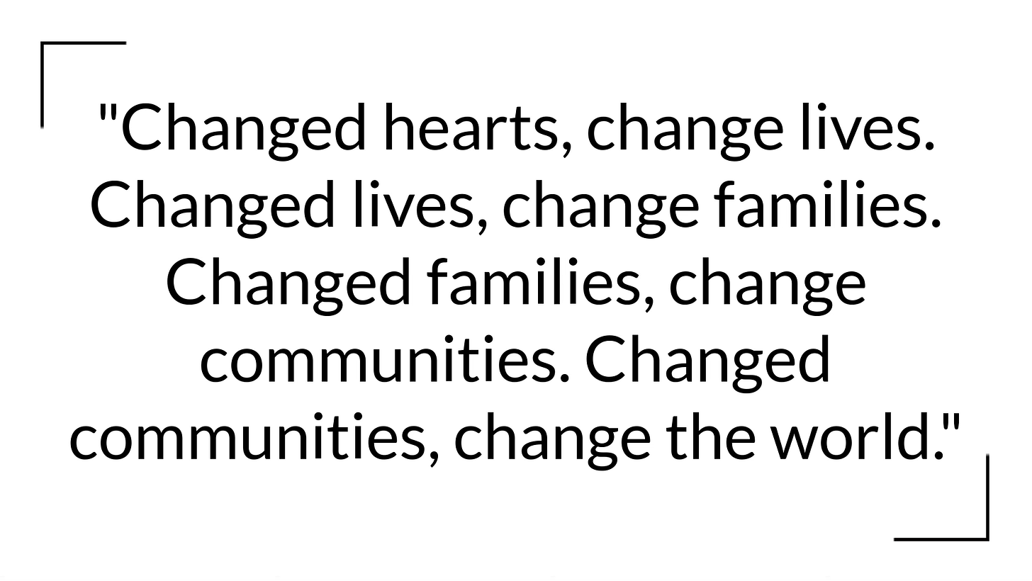 The other thing we see in this passage is that the kingdom of God comes through the gospel. That's ultimately how the kingdom of God comes. It comes through faithfully pointing people to Christ, sharing the gospel, then people believing in that gospel and being transformed by that gospel. Again, it's not very flashy. It's not showy. It's not because of our power and authority. It's simply sharing the gospel over and over and over again with those who don't believe. Then as people begin to put their faith and trust in the gospel, they're cleansed of their sins, and their hearts are transformed and they give their lives to Jesus Christ. It's not always flashy and showy, but it is powerful. One of my favorite sayings is, "Changed hearts, change lives. Changed lives, change families. Changed families, change communities. Changed communities, change the world." It's not always flashy. It's sometimes extremely slow and painstaking work. It's not the result of our power and ability. It's a simple, ordinary, humble, mundane task of pointing people to Jesus Christ for the forgiveness of their sins and the transformation of their lives. That's how the kingdom comes and it's powerful.