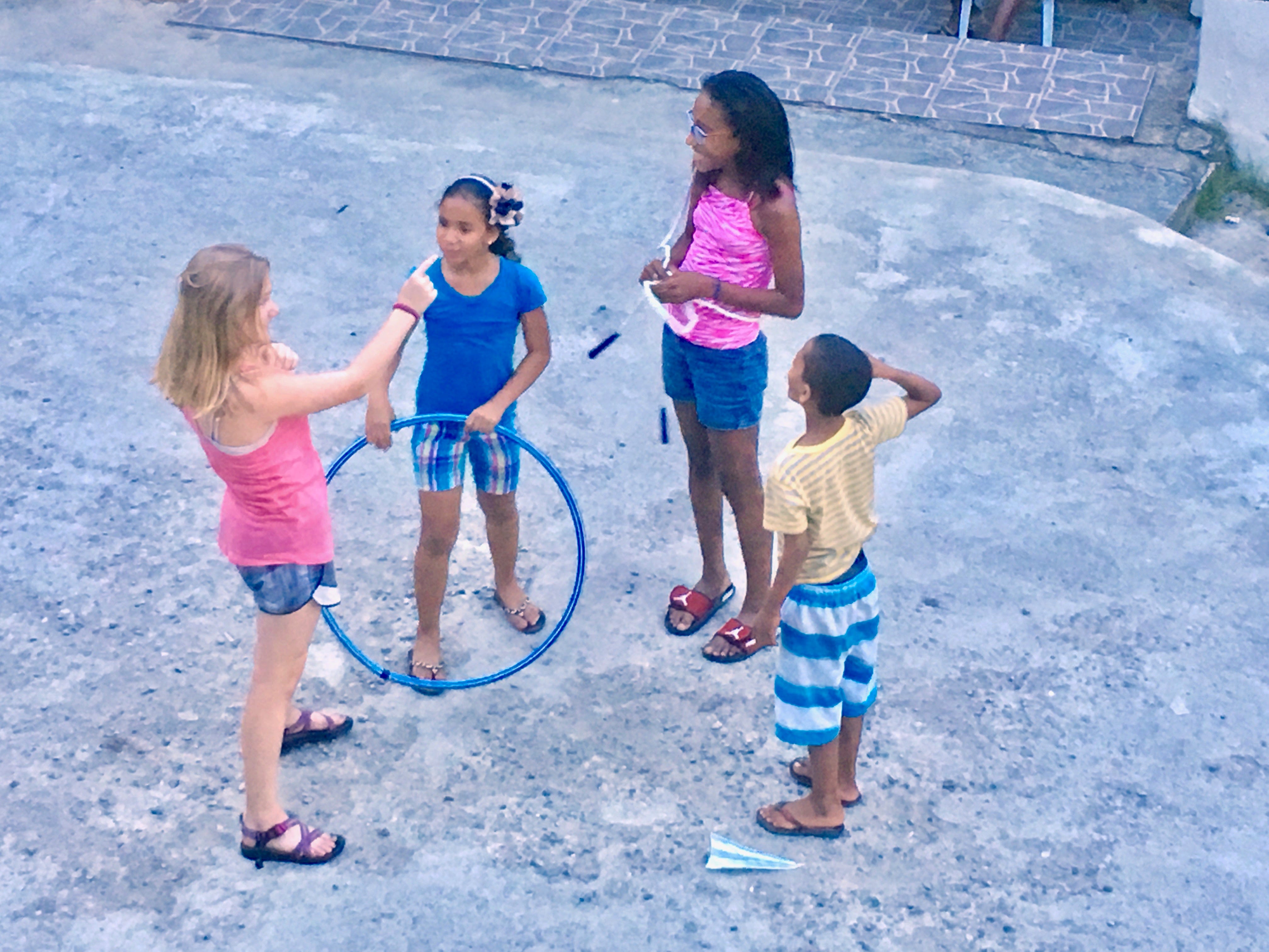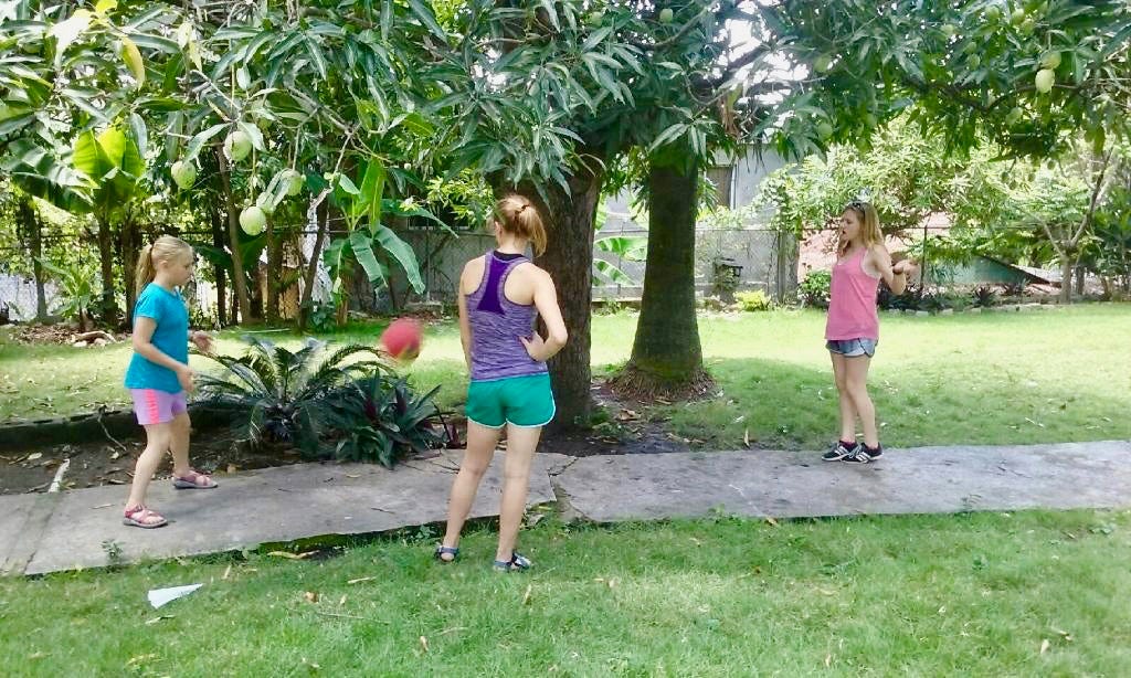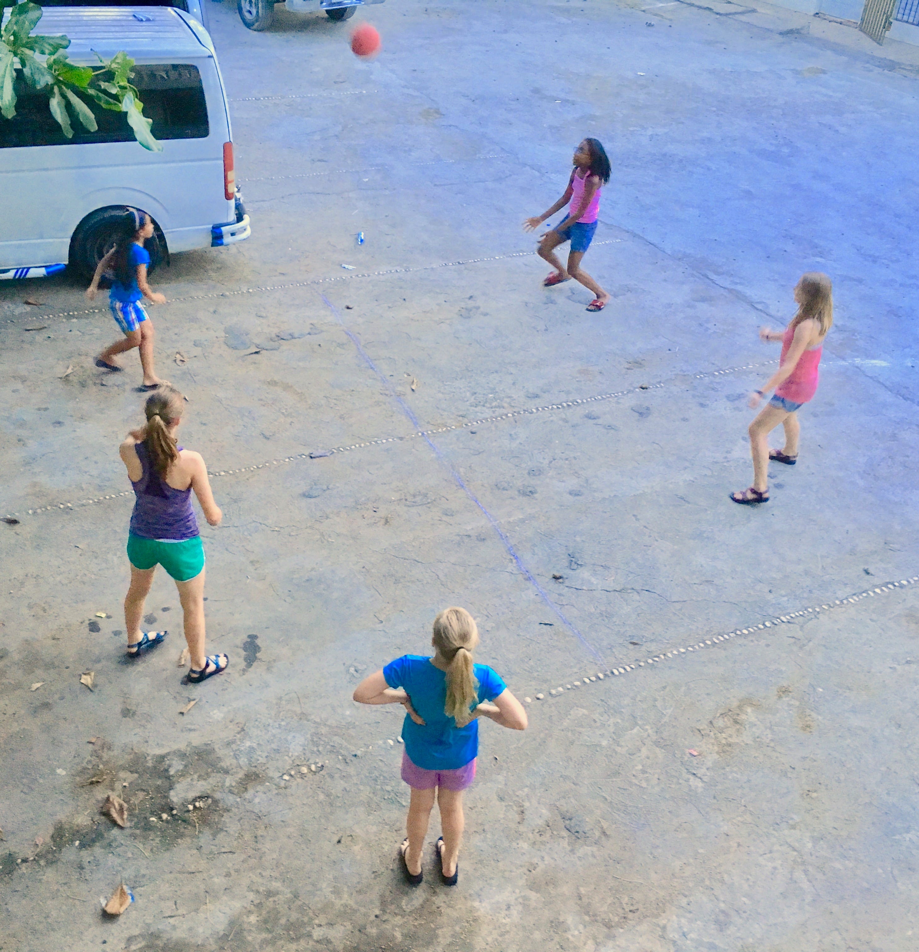 Then, after we had eaten supper, Erin walked outside to do something. She ran into some of the local kids and started trying to communicate with them. She told them she didn't know Spanish, but did a good job trying to communicate through hand motions, actions, and whatever Spanish she knew. They were having a good time. Then, she brought all of her sisters out and they began teaching the local kids how to play four-square. They did a good job. The local kids didn't quite pick up all of the rules, but picked it up enough to play the game for a while. The kids all came in with big smiles on their face saying, "That was so much fun!" They all decided to meet together tomorrow to play some more.