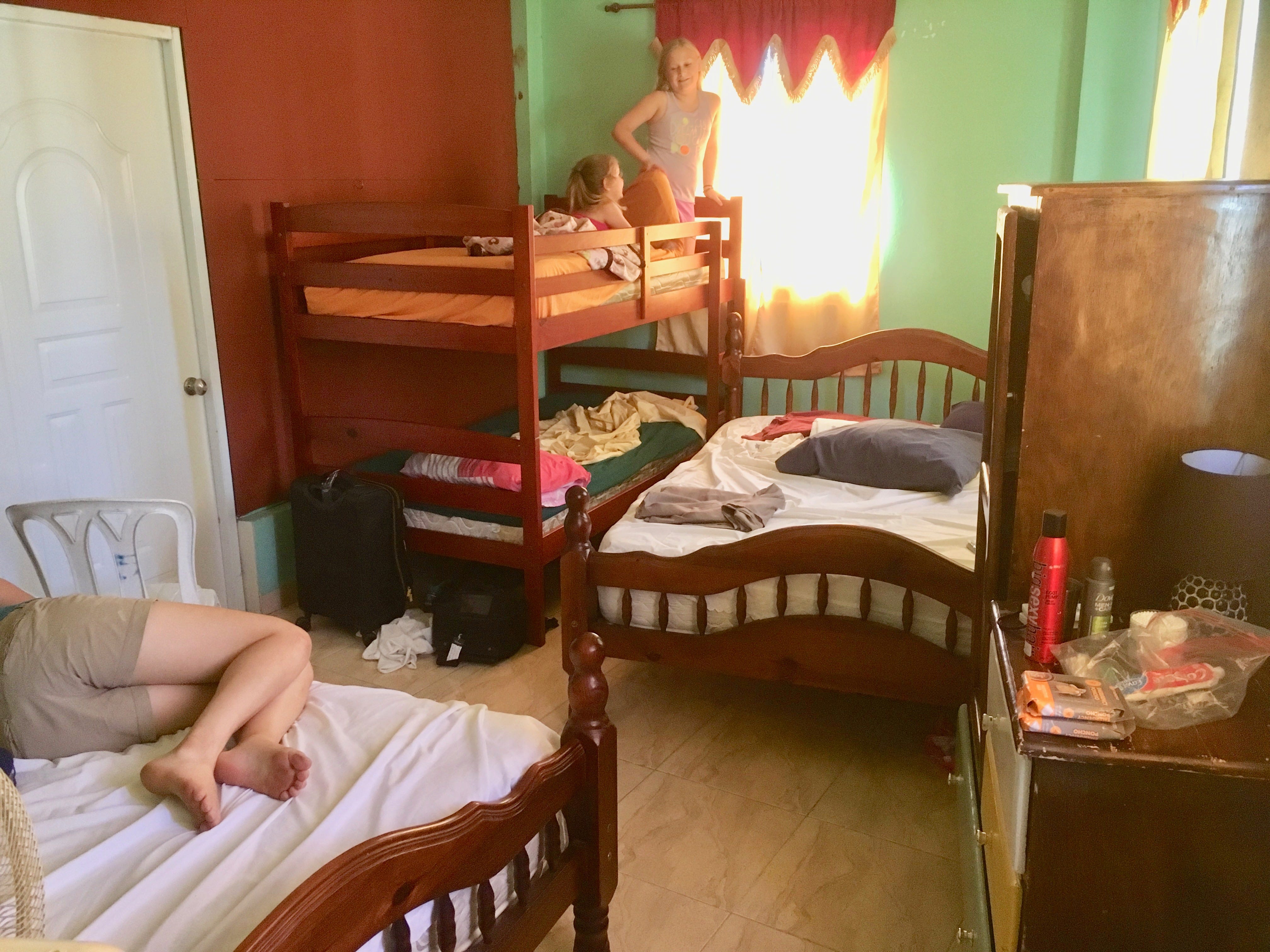 Well, the big story of the day regards a small move for our family. There was some miscommunication between organizations, which resulted in us sharing our apartment with a few other young women in their early twenties. They had one room all to themselves, we had two of the rooms, and we shared the common area in the middle. Two of the young women headed back home yesterday, and the other is heading to another location in the next couple of days. So, we were able to rearrange the sleeping arrangements. This was a big deal for our family because their room had A/C! The girls were very excited to be able to get a break from the heat throughout the day and were looking forward to sleeping in a room with A/C. The only issue is that A/C only works when the power is on. So, there is the possibility of not having it throughout the night. However, we will have it at times. That's a great thing. We were creative with organizing the room so that the whole family could sleep there together (as you can see from the picture below). We'll see how it goes :-)