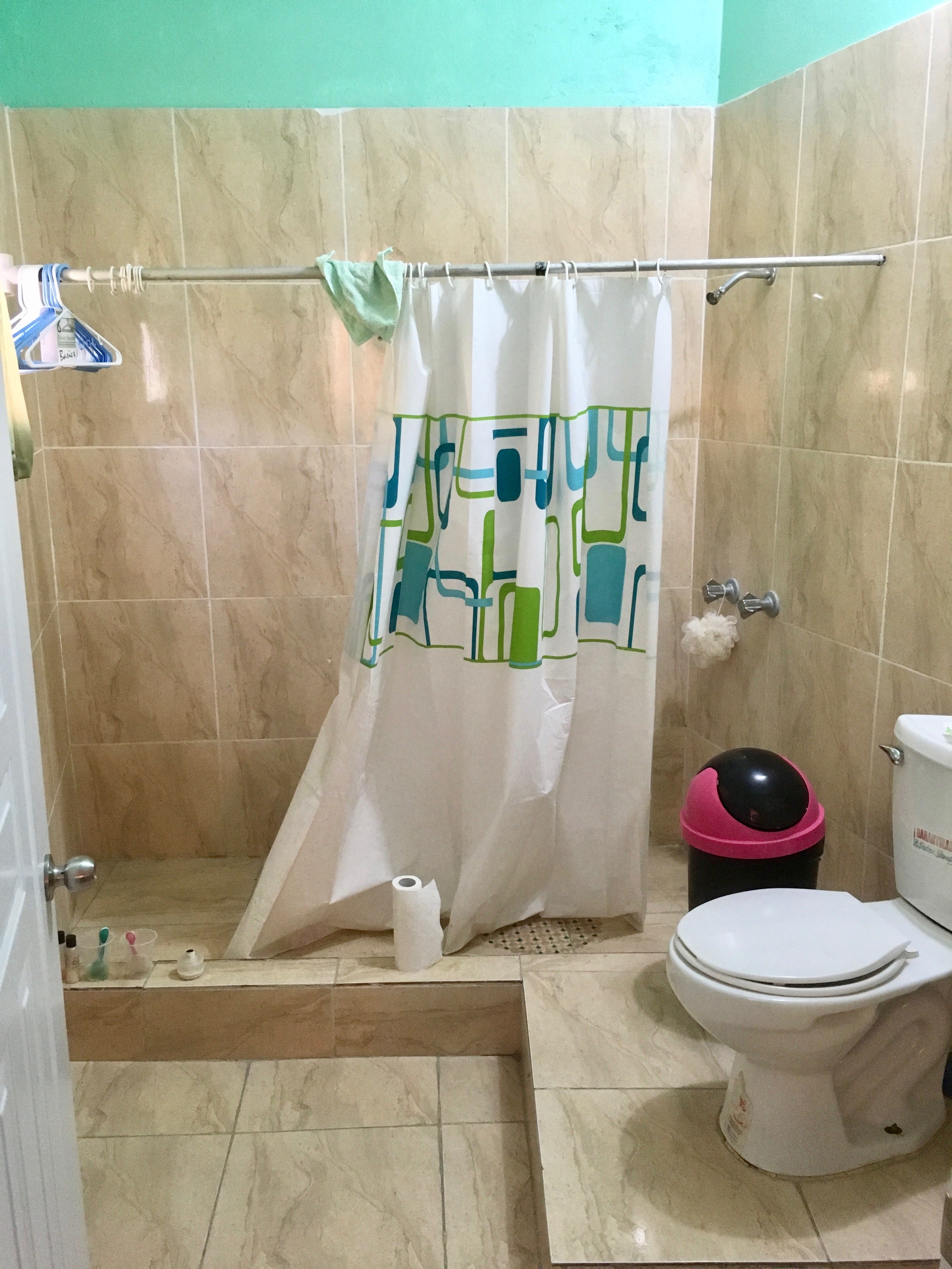 I realized that I haven't shared many pictures of what our apartment looks like. So I decided to do some of that in today's post. The picture at the top of the post is of the kitchen/dining/living room :-). Basically, that's the common area of the apartment. The picture of the beds is the room we will be sleeping in the rest of our stay. There are another couple of bedrooms that are off to the side of the common area. Every bedroom has it's own bathroom and shower. So, once again, we have more bathrooms in the Dominican Republic than we do back in the States. Below is a picture of one of the bathrooms.