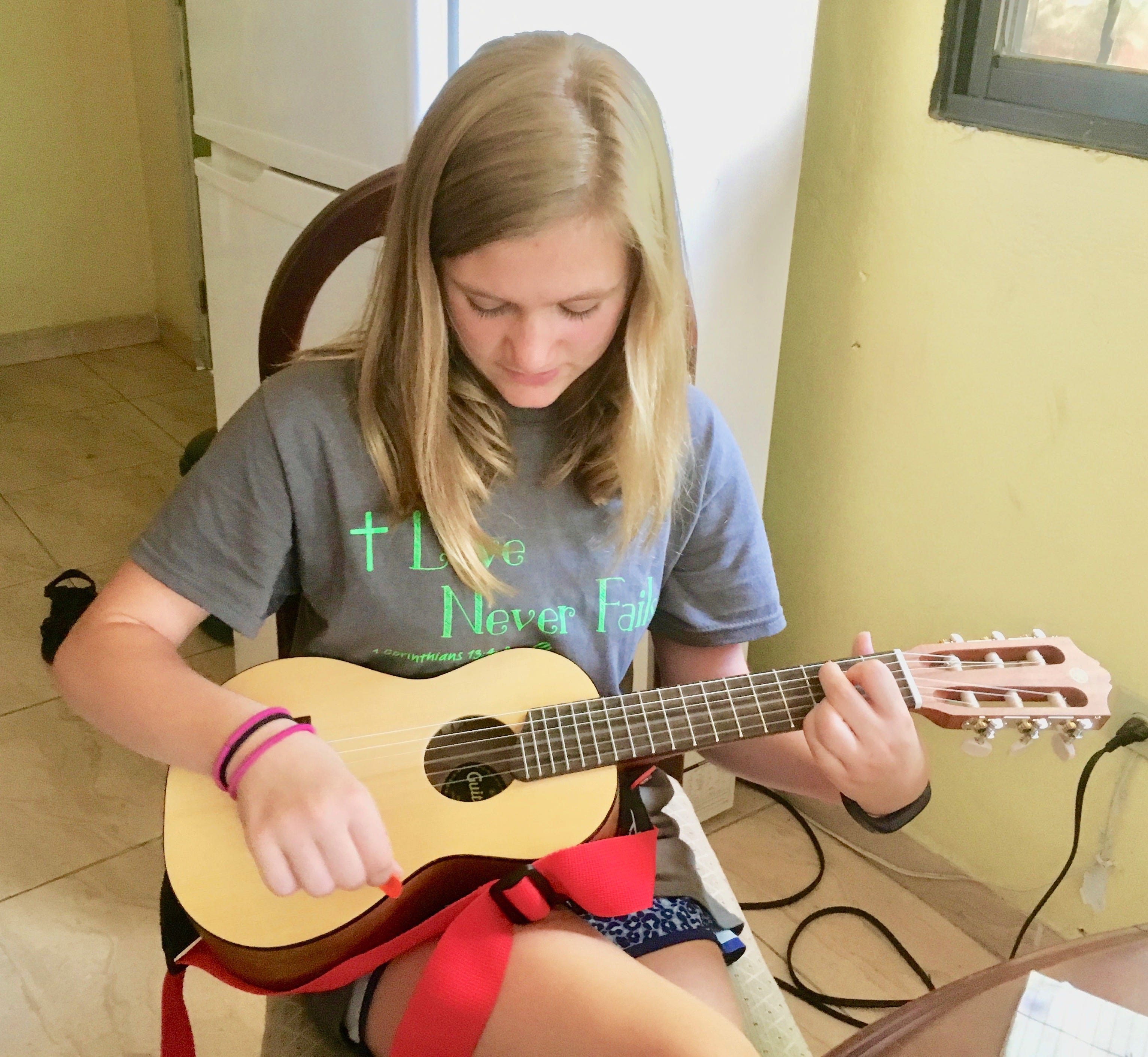 We spent much of the day reading, writing, drawing, playing games, etc... The kids have also been investing all of this free time in learning how to play the guitar. A friend of mine, Matt Krotzer, lent me his guitalele (a cross between a guitar and a ukele) so that I could maybe lead worship at some of the VBS programs we will be leading. I'm not even sure we'll be able to use it for that, however, the girls have been practicing like crazy and are doing very well. I taught them the chords for "How He Loves" by David Crowder and wrote them down on a sheet of paper. They have been practicing it over, and over, and over, and over again. They are getting pretty good. We've been laughing that it took us coming to the Dominican Republic for them to finally learn guitar. However, was it really took was a slower pace of life and taking time to learn.