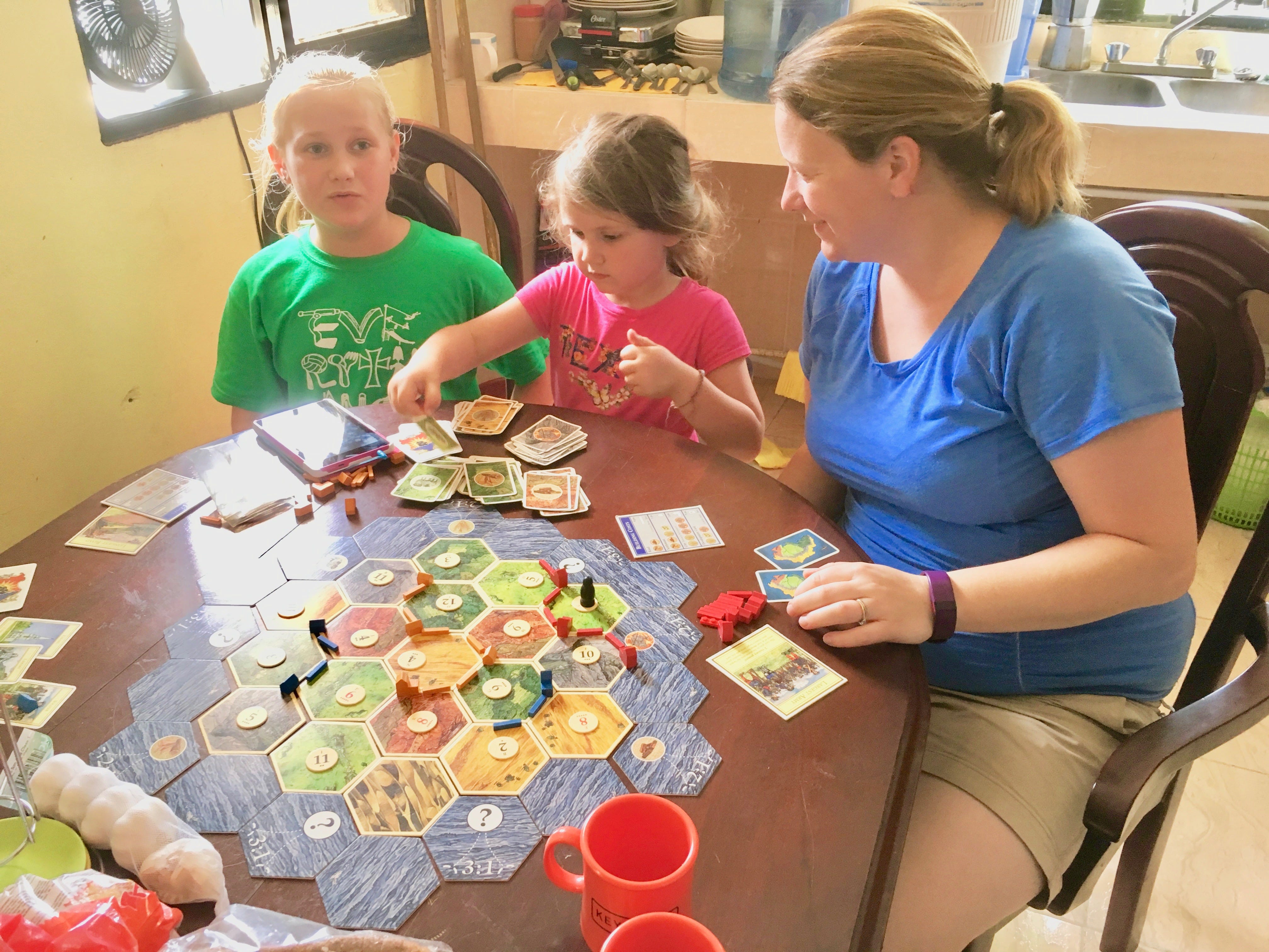 We got back to the apartment a little after noon, made some lunch, and then took naps. We've definitely been noticing that we are tired more often. At orientation they told us that this is pretty typical when adjusting to a different culture--everything wears on you, including the heat. So, we read and slept. Rachel, Zoe, and Lauren also took some time to play a game of Settlers of Catan. Zoe won and was very excited.