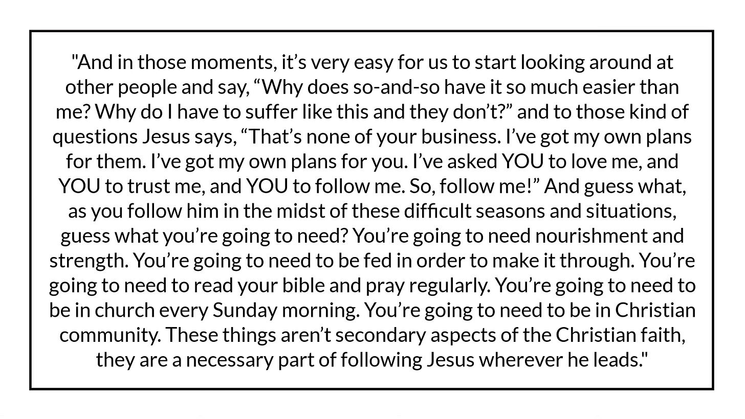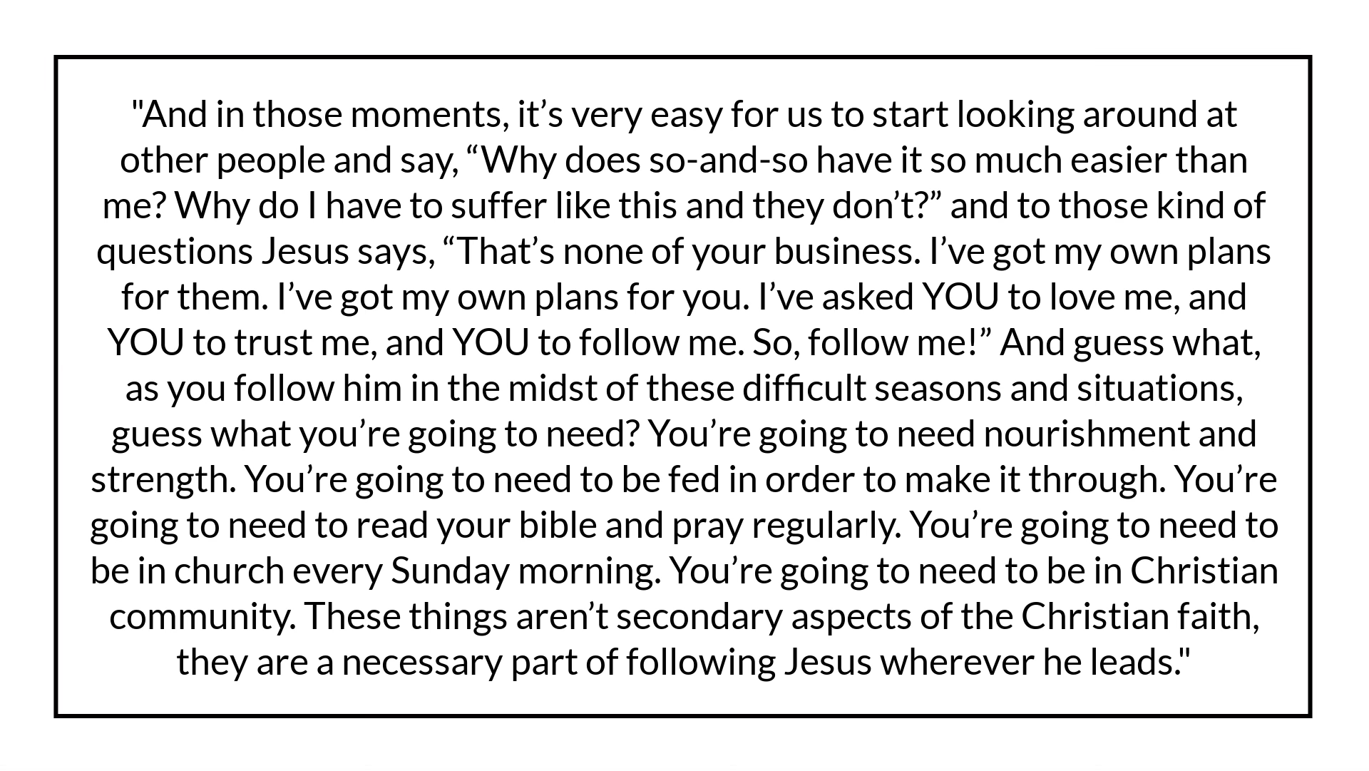 And part of that message is the fact that sometimes following Jesus means entering into very difficult places and situations—or enduring periods of difficulty. And in those moments, it’s very easy for us to start looking around at other people and say, “Why does so-and-so have it so much easier than me? Why do I have to suffer like this and they don’t?” and to those kind of questions Jesus says, “That’s none of your business. I’ve got my own plans for them. I’ve got my own plans for you. I’ve asked YOU to love me, and YOU to trust me, and YOU to follow me. So, follow me!” And guess what, as you follow him in the midst of these difficult seasons and situations, guess what you’re going to need? You’re going to need nourishment and strength. You’re going to need to be fed in order to make it through. You’re going to need to read your bible and pray regularly. You’re going to need to be in church every Sunday morning. You’re going to need to be in Christian community. These things aren’t secondary aspects of the Christian faith, they are a necessary part of following Jesus wherever he leads. Do you love him? Then follow him wherever he leads you, hunger to be fed and nourished by him and to feed his sheep, even if that means going through a long season off difficulty and suffering.