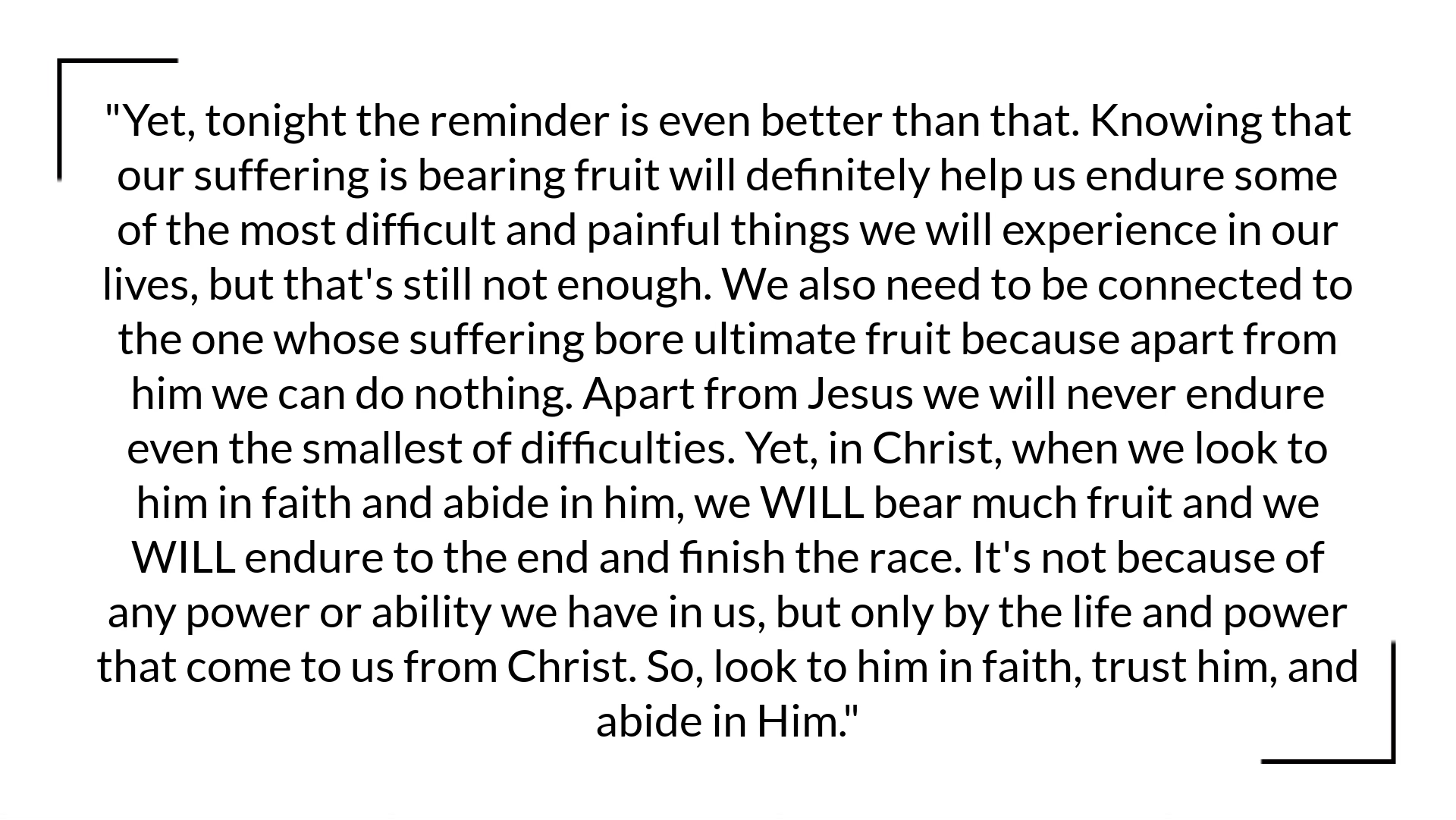 Yet, tonight the reminder is even better than that. Knowing that our suffering is bearing fruit will definitely help us endure some of the most difficult and painful things we will experience in our lives, but that's still not enough. We also need to be connected to the one whose suffering bore ultimate fruit because apart from him we can do nothing. Apart from Jesus we will never endure even the smallest of difficulties. Yet, in Christ, when we look to him in faith and abide in him, we WILL bear much fruit and we WILL endure to the end and finish the race. It's not because of any power or ability we have in us, but only by the life and power that come to us from Christ. So, look to him in faith, trust him, and abide in Him.