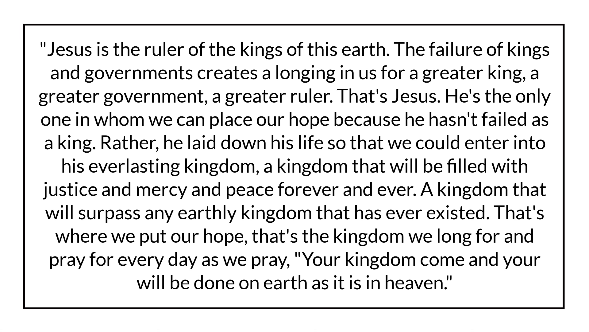Jesus is the ruler of the kings of this earth. The failure of kings and governments creates a longing in us for a greater king, a greater government, a greater ruler. That's Jesus. He's the only one in whom we can place our hope because he hasn't failed as a king. Rather, he laid down his life so that we could enter into his everlasting kingdom, a kingdom that will be filled with justice and mercy and peace forever and ever. A kingdom that will surpass any earthly kingdom that has ever existed. That's where we put our hope, that's the kingdom we long for and pray for every day as we pray, "Your kingdom come and your will be done on earth as it is in heaven."