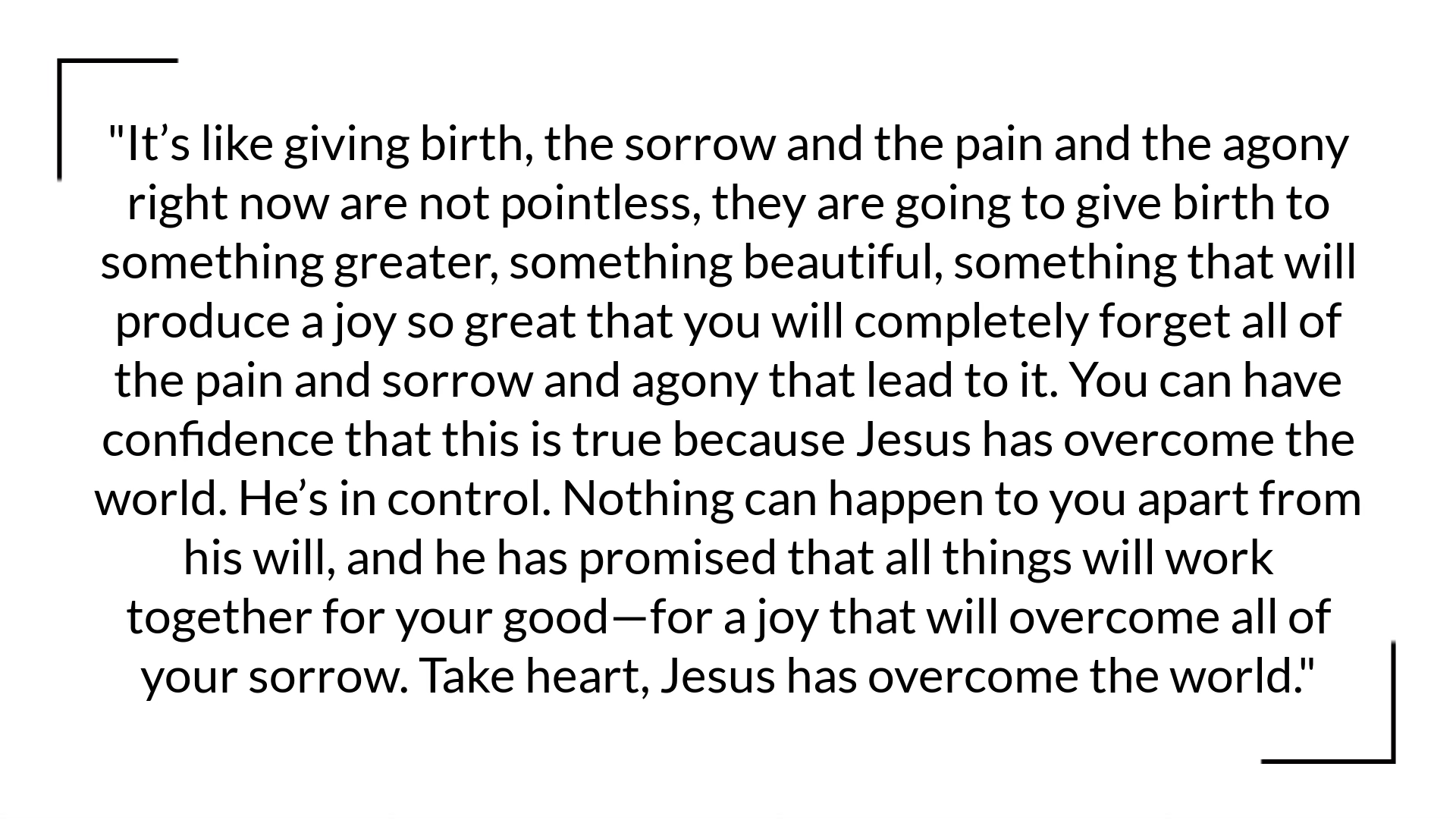 Yet also realize something deeper. The tribulations you are currently facing, or will face in the future, are accomplishing something—something that we don’t realize in the moment. It’s like giving birth, the sorrow and the pain and the agony right now are not pointless, they are going to give birth to something greater, something beautiful, something that will produce a joy so great that you will completely forget all of the pain and sorrow and agony that lead to it. You can have confidence that this is true because Jesus has overcome the world. He’s in control. Nothing can happen to you apart from his will, and he has promised that all things will work together for your good—for a joy that will overcome all of your sorrow. Take heart, Jesus has overcome the world.