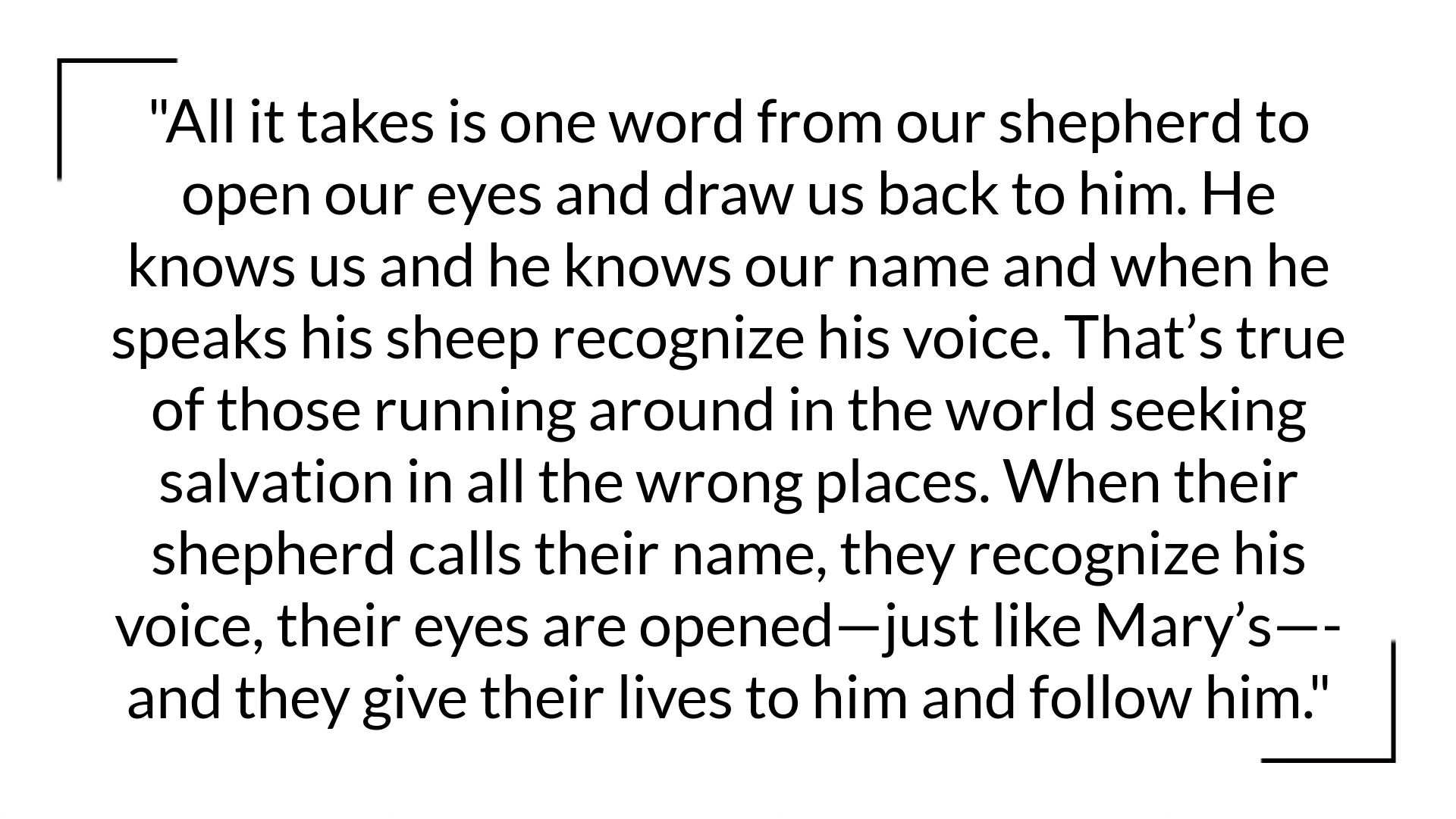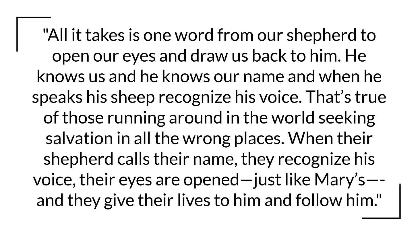 Yet, the flip side of this story is just as powerful. All it takes is one word from our shepherd to open our eyes and draw us back to him. He knows us and he knows our name and when he speaks his sheep recognize his voice. That’s true of those running around in the world seeking salvation in all the wrong places. When their shepherd calls their name, they recognize his voice, their eyes are opened—just like Mary’s—and they give their lives to him and follow him.