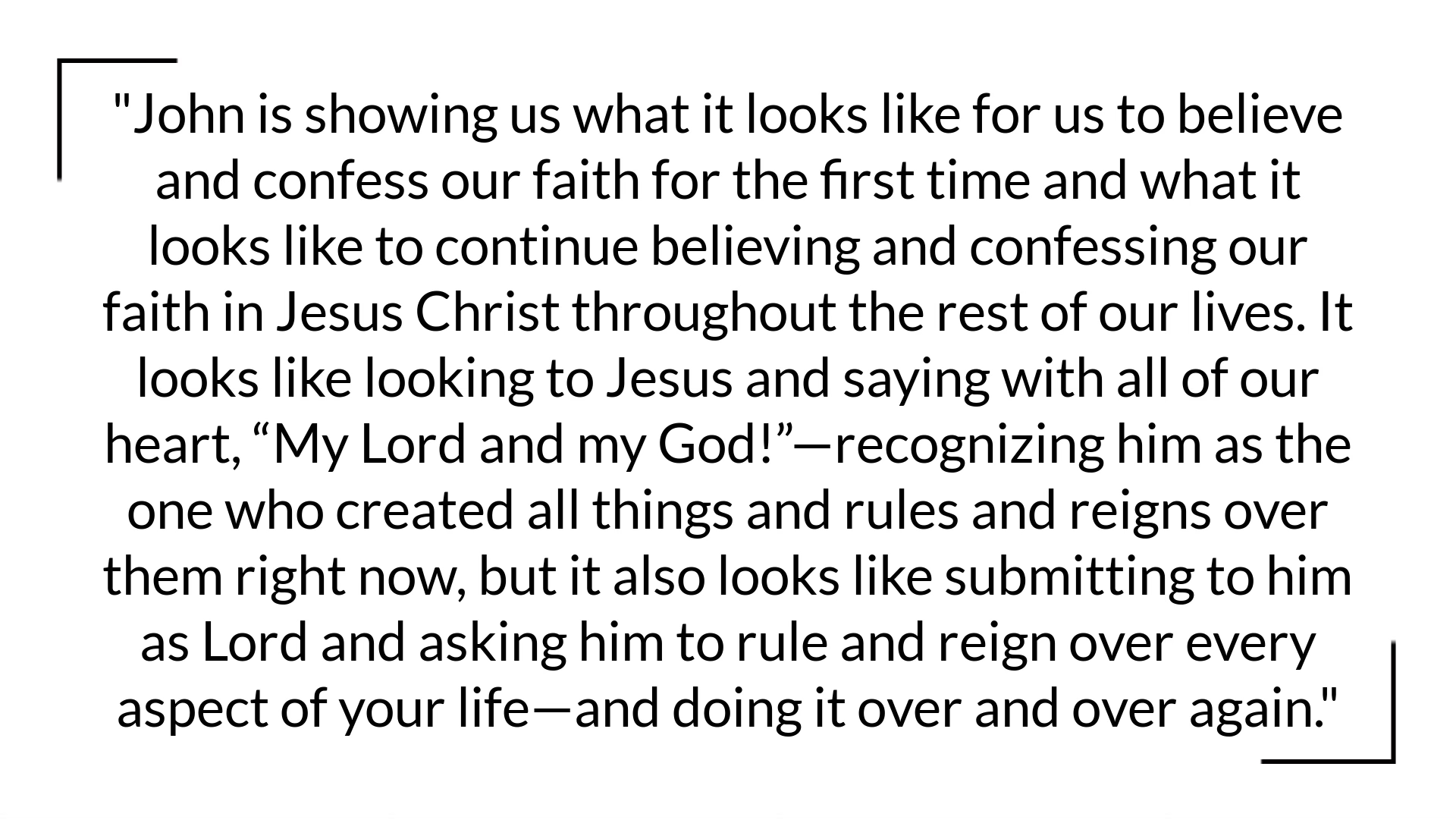 Ultimately, this story is about what it looks like to confess our faith—what it looks like to believe. And it’s not just for those outside the church. It’s for Christians as well. John is showing us what it looks like for us to believe and confess our faith for the first time and what it looks like to continue believing and confessing our faith in Jesus Christ throughout the rest of our lives. It looks like looking to Jesus and saying with all of our heart, “My Lord and my God!”—recognizing him as the one who created all things and rules and reigns over them right now, but it also looks like submitting to him as Lord and asking him to rule and reign over every aspect of your life—and doing it over and over again.