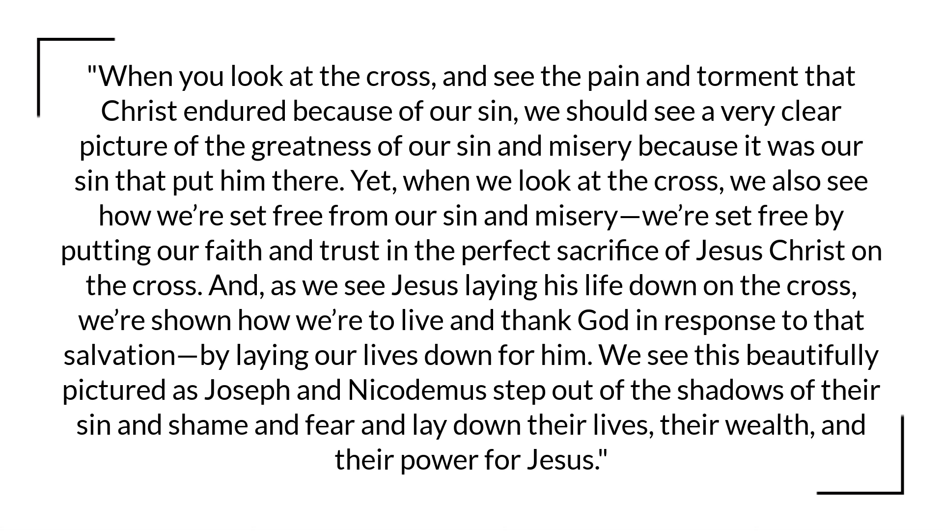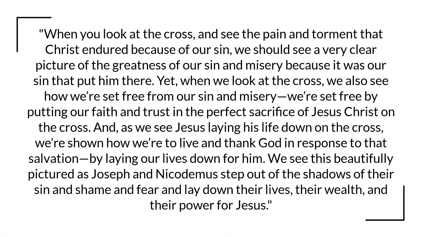 This is the power of the cross that I talked about last week. When you look at the cross, and see the pain and torment that Christ endured because of our sin, we should see a very clear picture of the greatness of our sin and misery because it was our sin that put him there. Yet, when we look at the cross, we also see how we’re set free from our sin and misery—we’re set free by putting our faith and trust in the perfect sacrifice of Jesus Christ on the cross. And, as we see Jesus laying his life down on the cross, we’re shown how we’re to live and thank God in response to that salvation—by laying our lives down for him. We see this beautifully pictured as Joseph and Nicodemus step out of the shadows of their sin and shame and fear and lay down their lives, their wealth, and their power for Jesus.