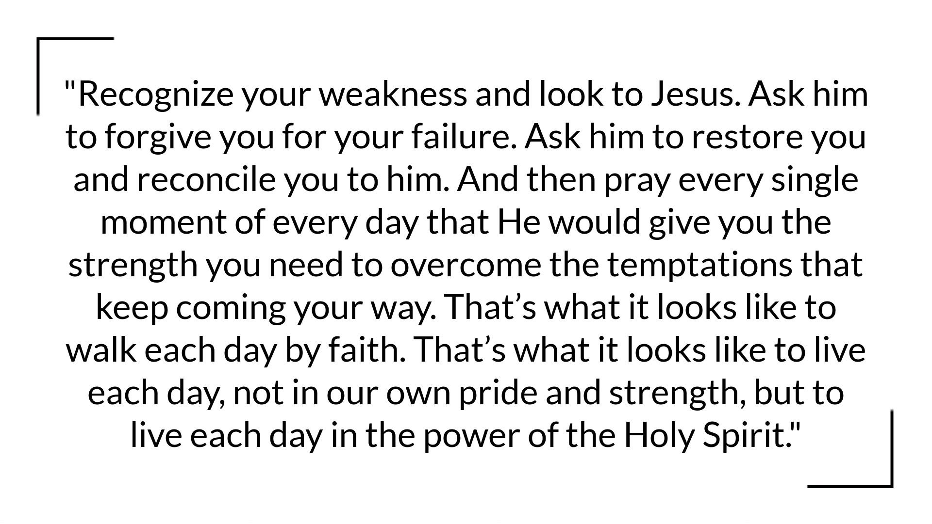 The same can be true of us. Maybe you’re here this morning and have failed greatly. Maybe you’ve denied Jesus Christ before men and are fearful that he will deny you before his Father in heaven. Maybe you’ve found yourself sliding down the slow path toward sin and death and feel enslaved and trapped, wondering if you’ll ever be able to get out. Look to Jesus. Don’t rely on your own strength. Don’t try to pull yourself up by your own bootstraps. Don’t think that you can rely on the same pride that got you into that mess. Instead, recognize your weakness and look to Jesus. Ask him to forgive you for your failure. Ask him to restore you and reconcile you to him. And then pray every single moment of every day that He would give you the strength you need to overcome the temptations that keep coming your way. That’s what it looks like to walk each day by faith. That’s what it looks like to live each day, not in our own pride and strength, but to live each day in the power of the Holy Spirit.