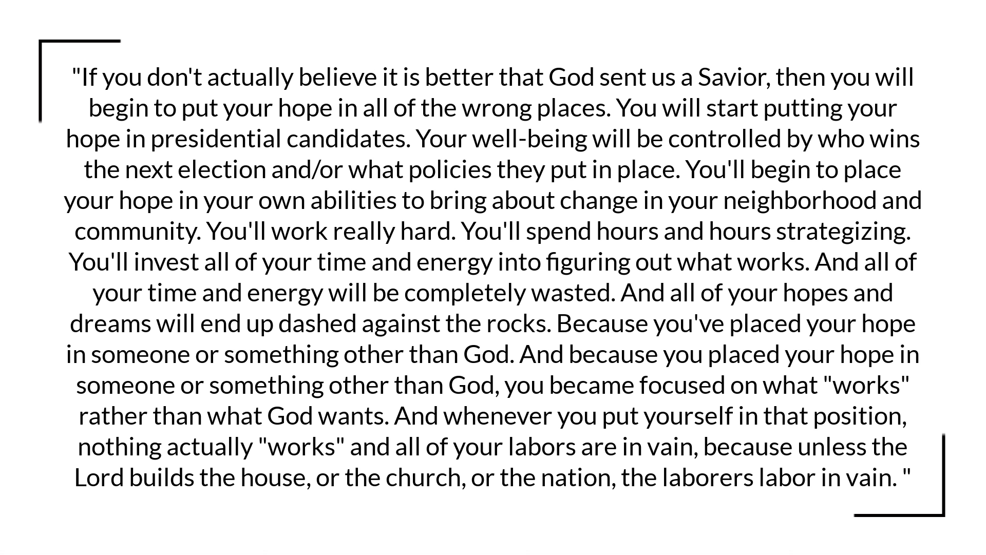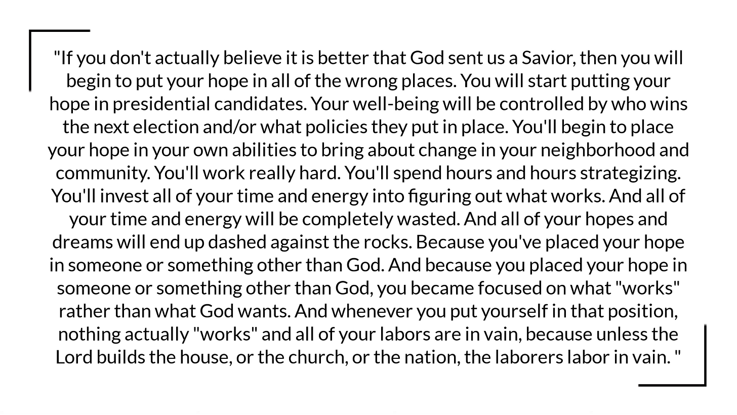 Because if you don't actually believe it is better that God sent us a Savior, then you will begin to put your hope in all of the wrong places. You will start putting your hope in presidential candidates. Your well-being will be controlled by who wins the next election and/or what policies they put in place. You'll begin to place your hope in your own abilities to bring about change in your neighborhood and community. You'll work really hard. You'll spend hours and hours strategizing. You'll invest all of your time and energy into figuring out what works. And all of your time and energy will be completely wasted. And all of your hopes and dreams will end up dashed against the rocks. Because you've placed your hope in someone or something other than God. And because you placed your hope in someone or something other than God, you became focused on what "works" rather than what God wants. And whenever you put yourself in that position, nothing actually "works" and all of your labors are in vain, because unless the Lord builds the house, or the church, or the nation, the laborers labor in vain.