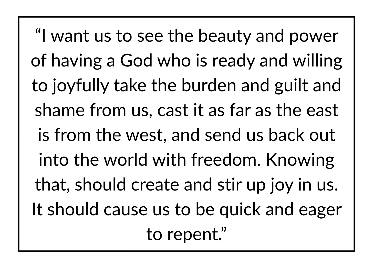 I’m belaboring the point, because I don’t think many people see the act of confessing and repenting of our sin as a joyful thing. Of course, we should not take it lightly. Of course, we should not be flippant about our sin. However, we also shouldn’t approach confession and repentance as dreadful things—things that we dread doing, things we would rather ignore. Rather, I want us to see the beauty and power of having a God who is ready and willing to joyfully take the burden and guilt and shame from us, cast it as far as the east is from the west, and send us back out into the world with freedom. Knowing that, should create and stir up joy in us. It should cause us to be quick and eager to repent.