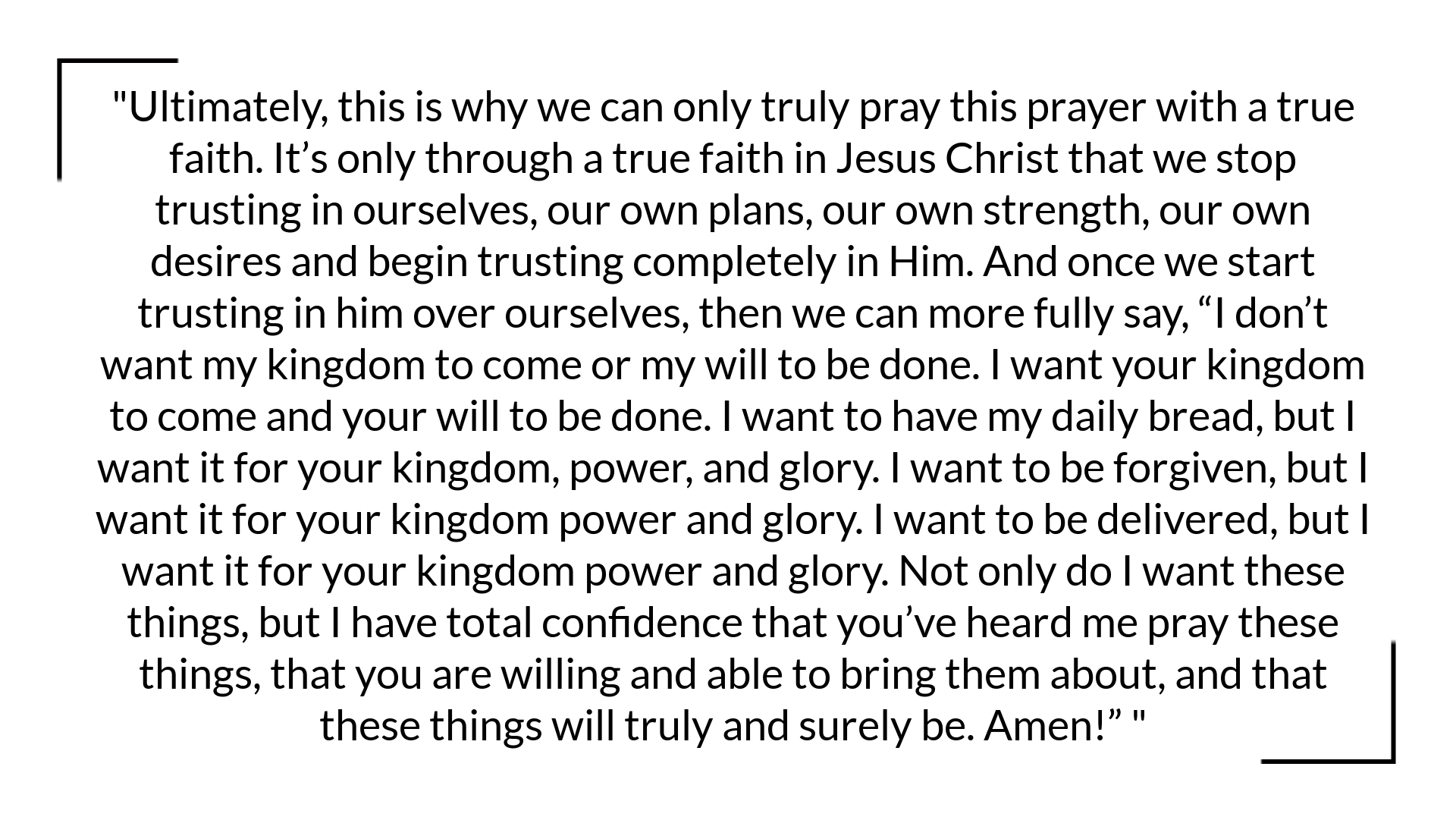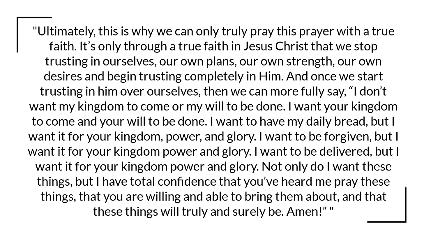 Ultimately, this is why we can only truly pray this prayer with a true faith. It’s only through a true faith in Jesus Christ that we stop trusting in ourselves, our own plans, our own strength, our own desires and begin trusting completely in Him. And once we start trusting in him over ourselves, then we can more fully say, “I don’t want my kingdom to come or my will to be done. I want your kingdom to come and your will to be done. I want to have my daily bread, but I want it for your kingdom, power, and glory. I want to be forgiven, but I want it for your kingdom power and glory. I want to be delivered, but I want it for your kingdom power and glory. Not only do I want these things, but I have total confidence that you’ve heard me pray these things, that you are willing and able to bring them about, and that these things will truly and surely be. Amen!”