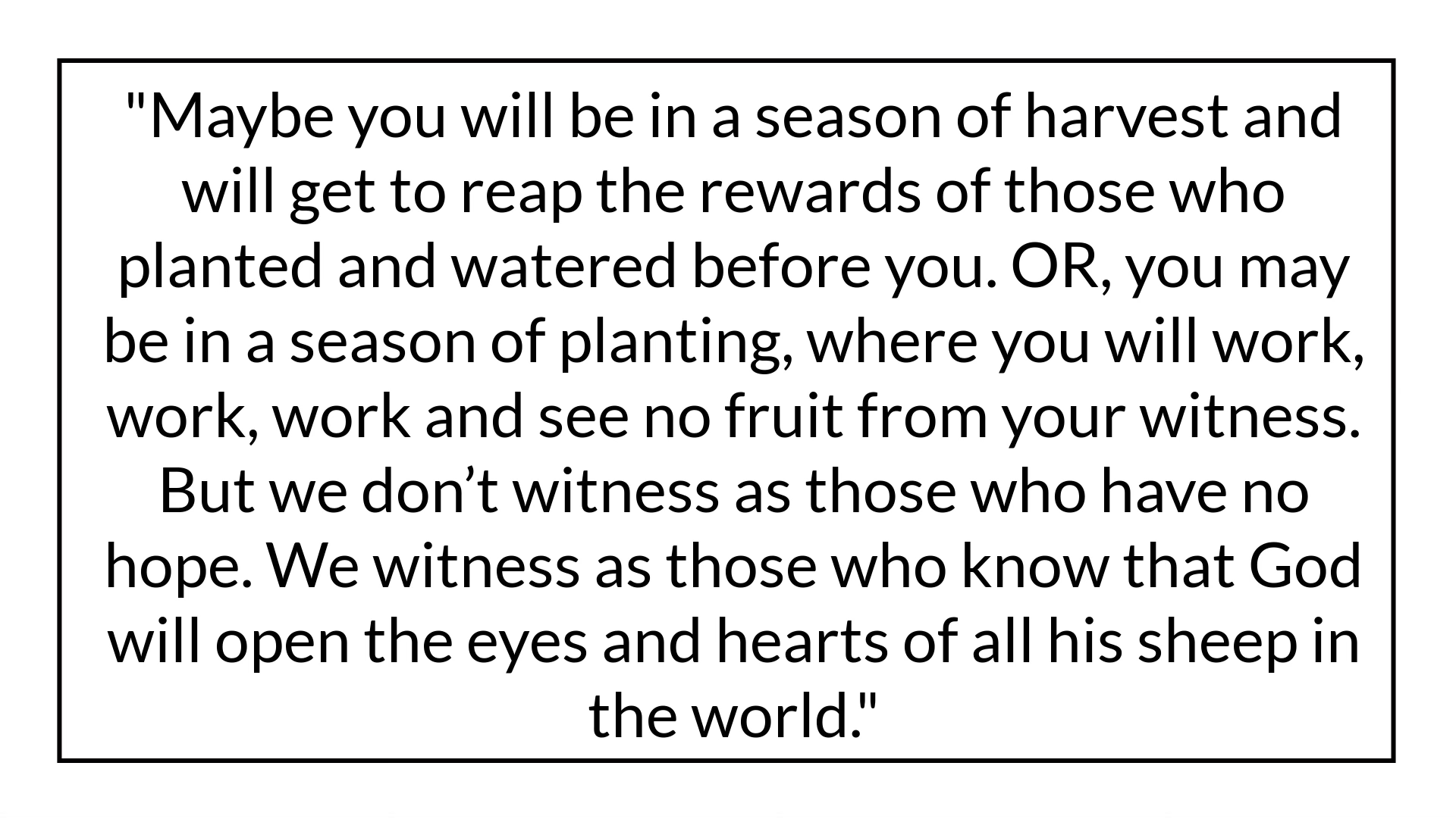 Who knows? Maybe you will be in a season of harvest and will get to reap the rewards of those who planted and watered before you. OR, you may be in a season of planting, where you will work, work, work and see no fruit from your witness. But we don’t witness as those who have no hope. We witness as those who know that God will open the eyes and hearts of all his sheep in the world. They will hear his voice and follow him and receive salvation. We may get to see that happen in our lifetime OR it may come over a hundred years after our lifetime. Doesn’t matter. Our job is to faithfully point people to Jesus wherever we are—whether in the temple or the desert—trusting him to use it for his kingdom and glory. That’s why we don’t lose heart. That’s why we keep on planting and watering and pointing people to Jesus Christ by faith.