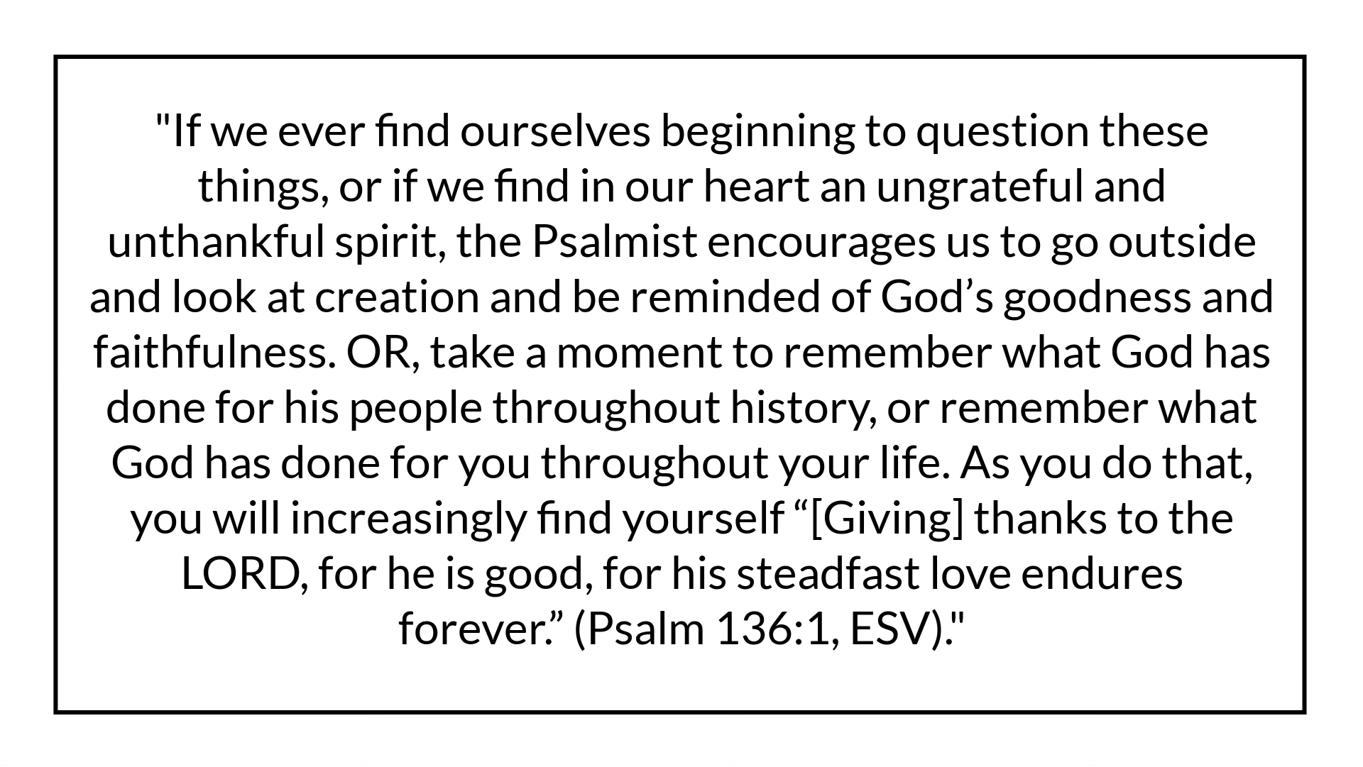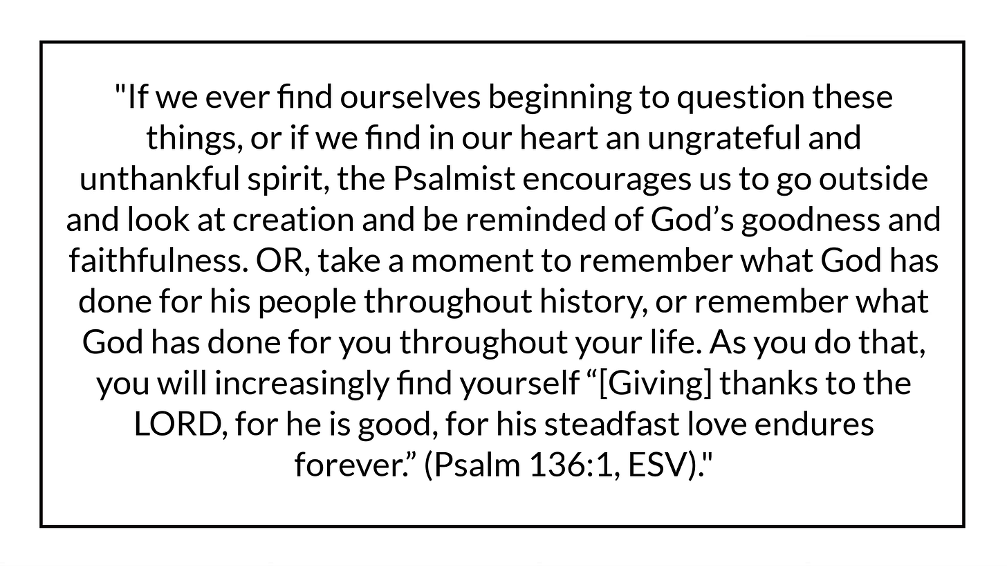 If we ever find ourselves beginning to question these things, or if we find in our heart an ungrateful and unthankful spirit, the Psalmist encourages us to go outside and look at creation and be reminded of God’s goodness and faithfulness. OR, take a moment to remember what God has done for his people throughout history, or remember what God has done for you throughout your life. As you do that, you will increasingly find yourself “[Giving] thanks to the LORD, for he is good, for his steadfast love endures forever.” (Psalm 136:1, ESV).