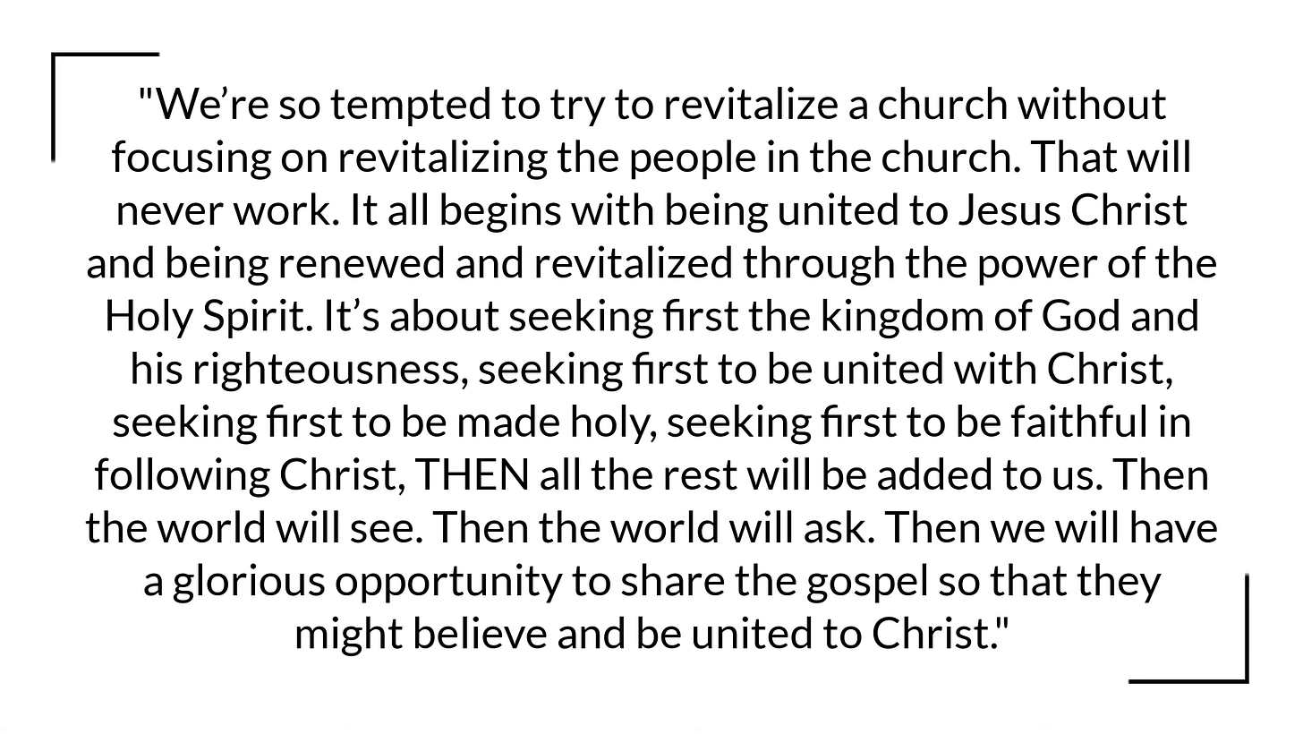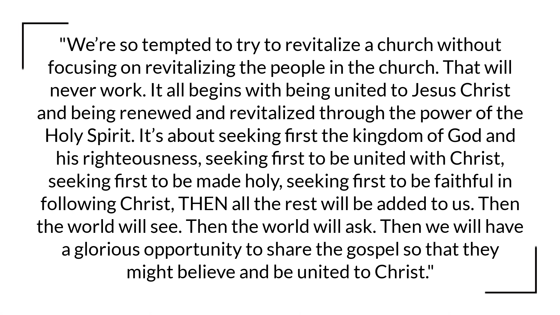 Yet, I want to end with the reminder that it begins with being united to Christ and transformed by the Spirit. We are so tempted to try to ignore that step and “get to work.” We’re so tempted to try to revitalize a church without focusing on revitalizing the people in the church. That will never work. It all begins with being united to Jesus Christ and being renewed and revitalized through the power of the Holy Spirit. It’s about seeking first the kingdom of God and his righteousness, seeking first to be united with Christ, seeking first to be made holy, seeking first to be faithful in following Christ, THEN all the rest will be added to us. Then the world will see. Then the world will ask. Then we will have a glorious opportunity to share the gospel so that they might believe and be united to Christ.