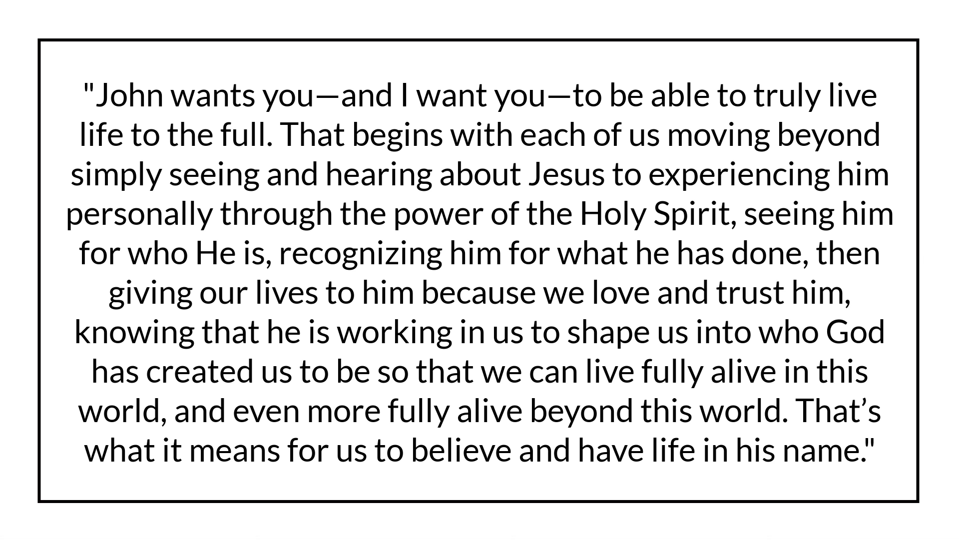 That’s why John has written this book. It’s why we’ve been spending so much time in this Gospel. John wants you—and I want you—to be able to truly live life to the full. That begins with each of us moving beyond simply seeing and hearing about Jesus to experiencing him personally through the power of the Holy Spirit, seeing him for who He is, recognizing him for what he has done, then giving our lives to him because we love and trust him, knowing that he is working in us to shape us into who God has created us to be so that we can live fully alive in this world, and even more fully alive beyond this world. That’s what it means for us to believe and have life in his name.