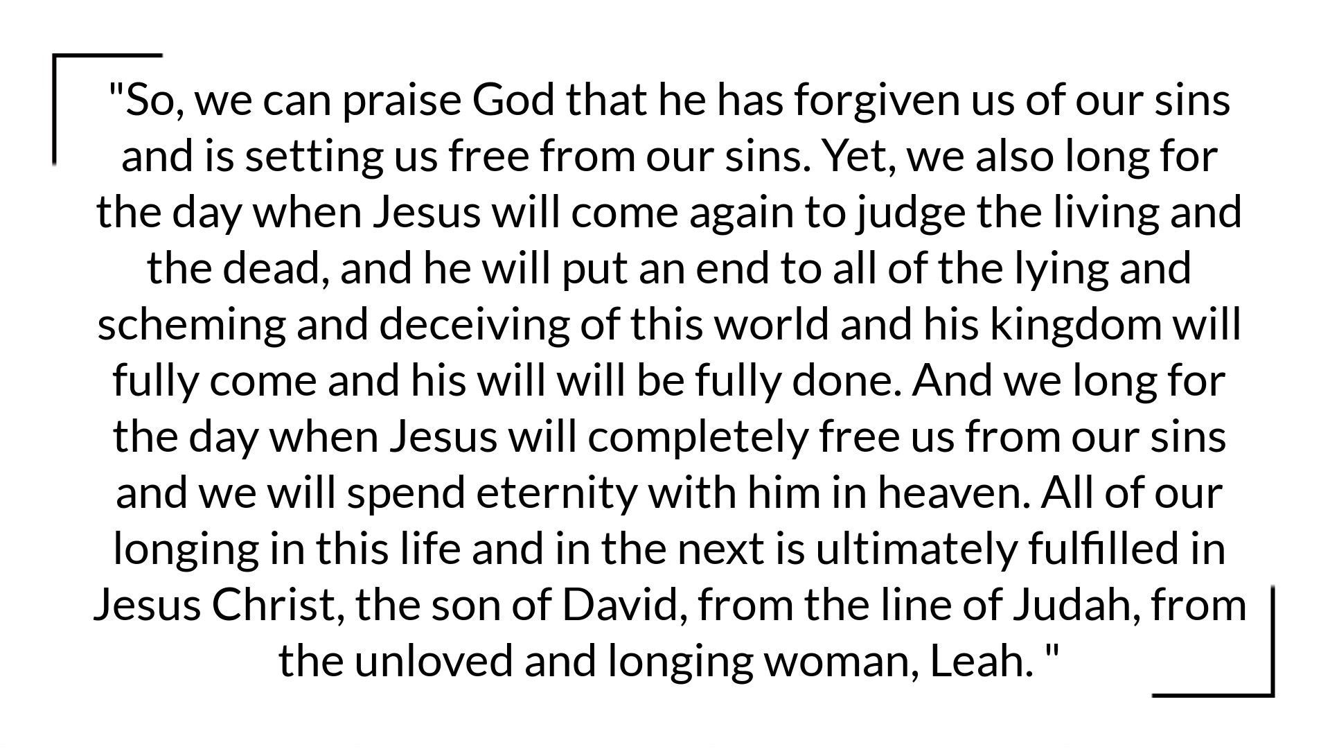 For us now, that means knowing that God sent his son to be born into this mess—and through deceit and lying and scheming—his son laid down his life for the forgiveness of our sins. Then, he rose again, showing us that he has even greater things in store. So, we can praise God that he has forgiven us of our sins and is setting us free from our sins. Yet, we also long for the day when Jesus will come again to judge the living and the dead, and he will put an end to all of the lying and scheming and deceiving of this world and his kingdom will fully come and his will will be fully done. And we long for the day when Jesus will completely free us from our sins and we will spend eternity with him in heaven. All of our longing in this life and in the next is ultimately fulfilled in Jesus Christ, the son of David, from the line of Judah, from the unloved and longing woman, Leah.