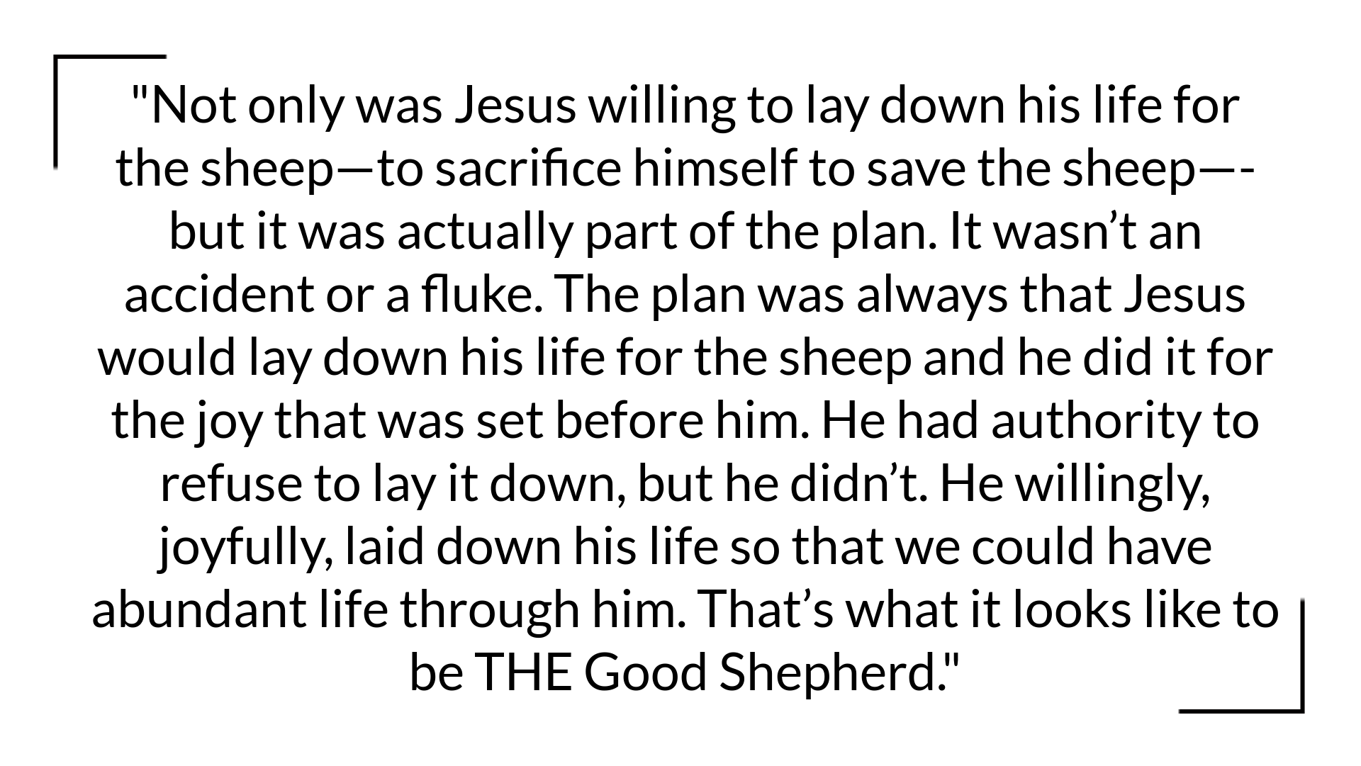 That statement actually gets stronger than that. Jesus goes on to say, “For this reason the Father loves me, because I lay down my life that I may take it up again. No one takes it from me, but I lay it down of my own accord. I have authority to lay it down, and I have authority to take it up again. This charge I have received from my Father.”” (John 10:17–18, ESV). Not only was Jesus willing to lay down his life for the sheep—to sacrifice himself to save the sheep—but it was actually part of the plan. It wasn’t an accident or a fluke. The plan was always that Jesus would lay down his life for the sheep and he did it for the joy that was set before him. He had authority to refuse to lay it down, but he didn’t. He willingly, joyfully, laid down his life so that we could have abundant life through him. That’s what it looks like to be THE Good Shepherd.