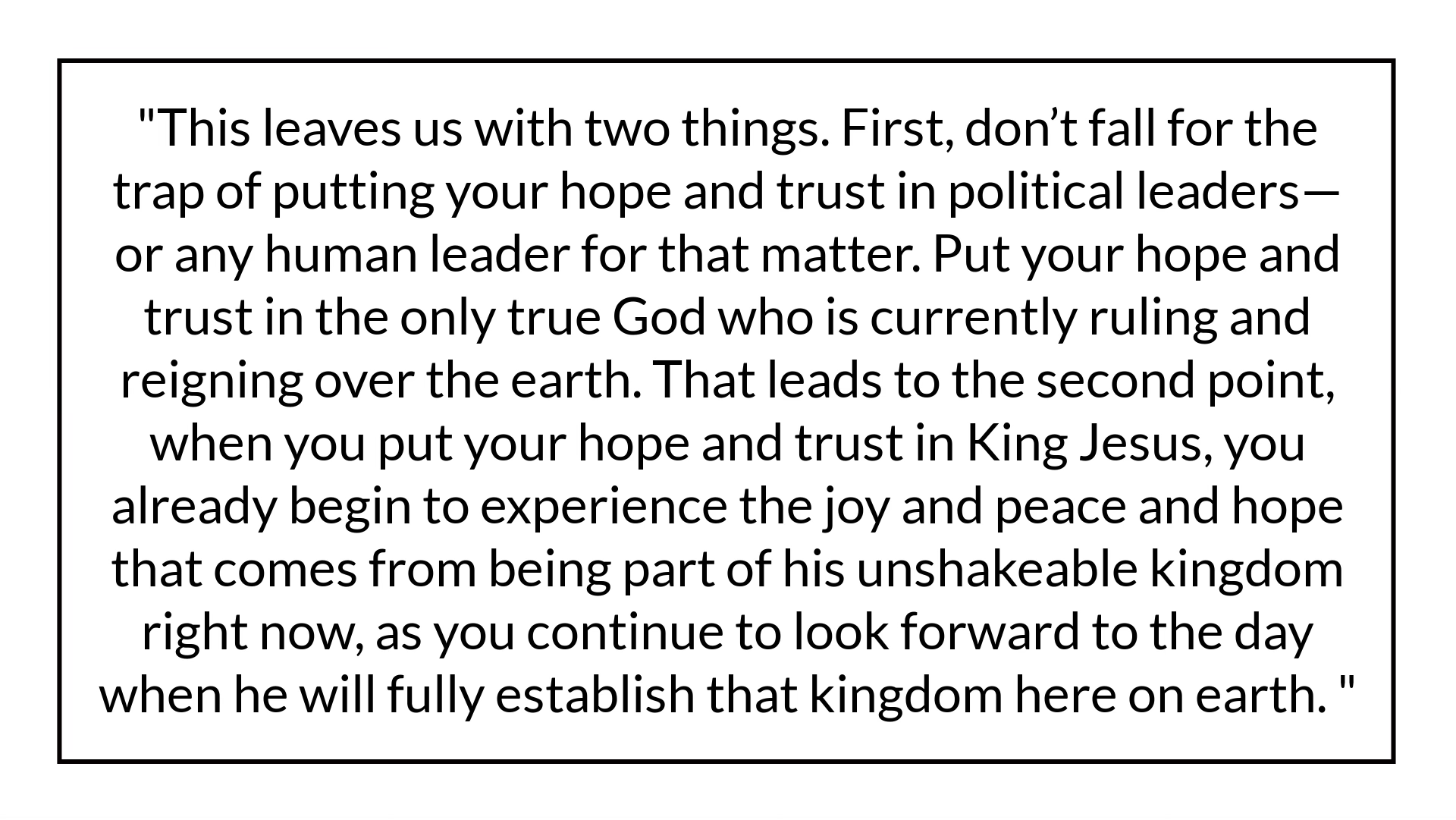 This leaves us with two things. First, don’t fall for the trap of putting your hope and trust in political leaders—or any human leader for that matter. Put your hope and trust in the only true God who is currently ruling and reigning over the earth. That leads to the second point, when you put your hope and trust in King Jesus, you already begin to experience the joy and peace and hope that comes from being part of his unshakeable kingdom right now, as you continue to look forward to the day when he will fully establish that kingdom here on earth.