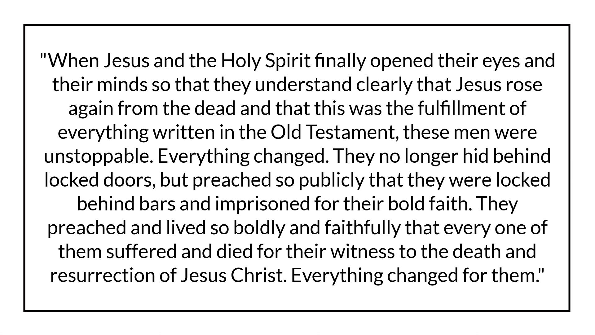 This is what we see in the fearful disciples. When Jesus and the Holy Spirit finally opened their eyes and their minds so that they understand clearly that Jesus rose again from the dead and that this was the fulfillment of everything written in the Old Testament, these men were unstoppable. Everything changed. They no longer hid behind locked doors, but preached so publicly that they were locked behind bars and imprisoned for their bold faith. They preached and lived so boldly and faithfully that every one of them suffered and died for their witness to the death and resurrection of Jesus Christ. Everything changed for them.