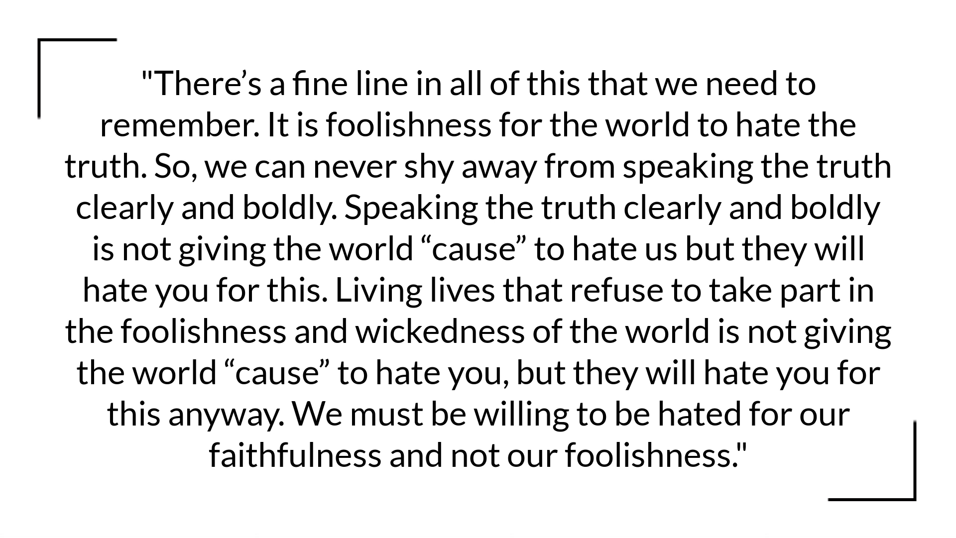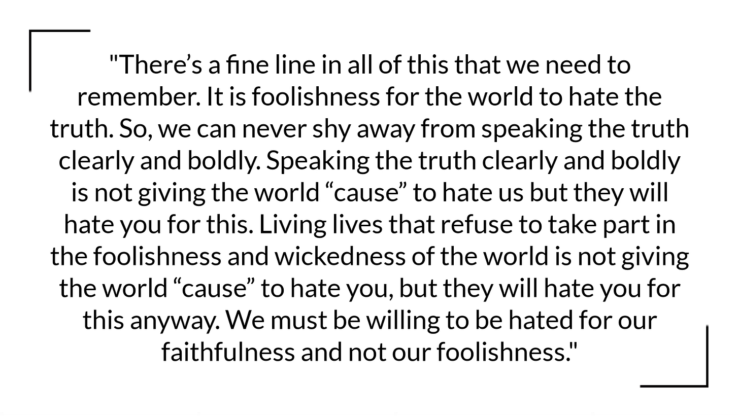 There’s a fine line in all of this that we need to remember. It is foolishness for the world to hate the truth. So, we can never shy away from speaking the truth clearly and boldly. Speaking the truth clearly and boldly is not giving the world “cause” to hate us but they will hate you for this. Living lives that refuse to take part in the foolishness and wickedness of the world is not giving the world “cause” to hate you, but they will hate you for this anyway. We must be willing to be hated for our faithfulness and not our foolishness.