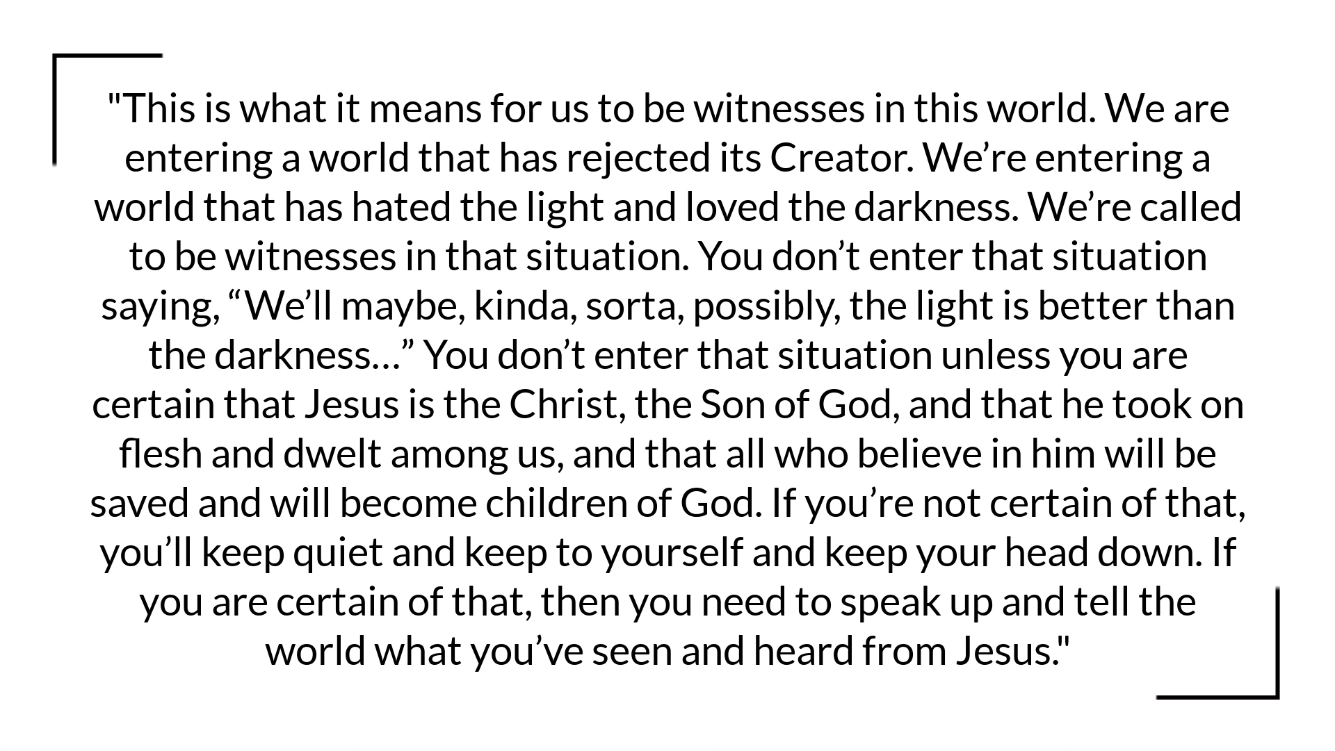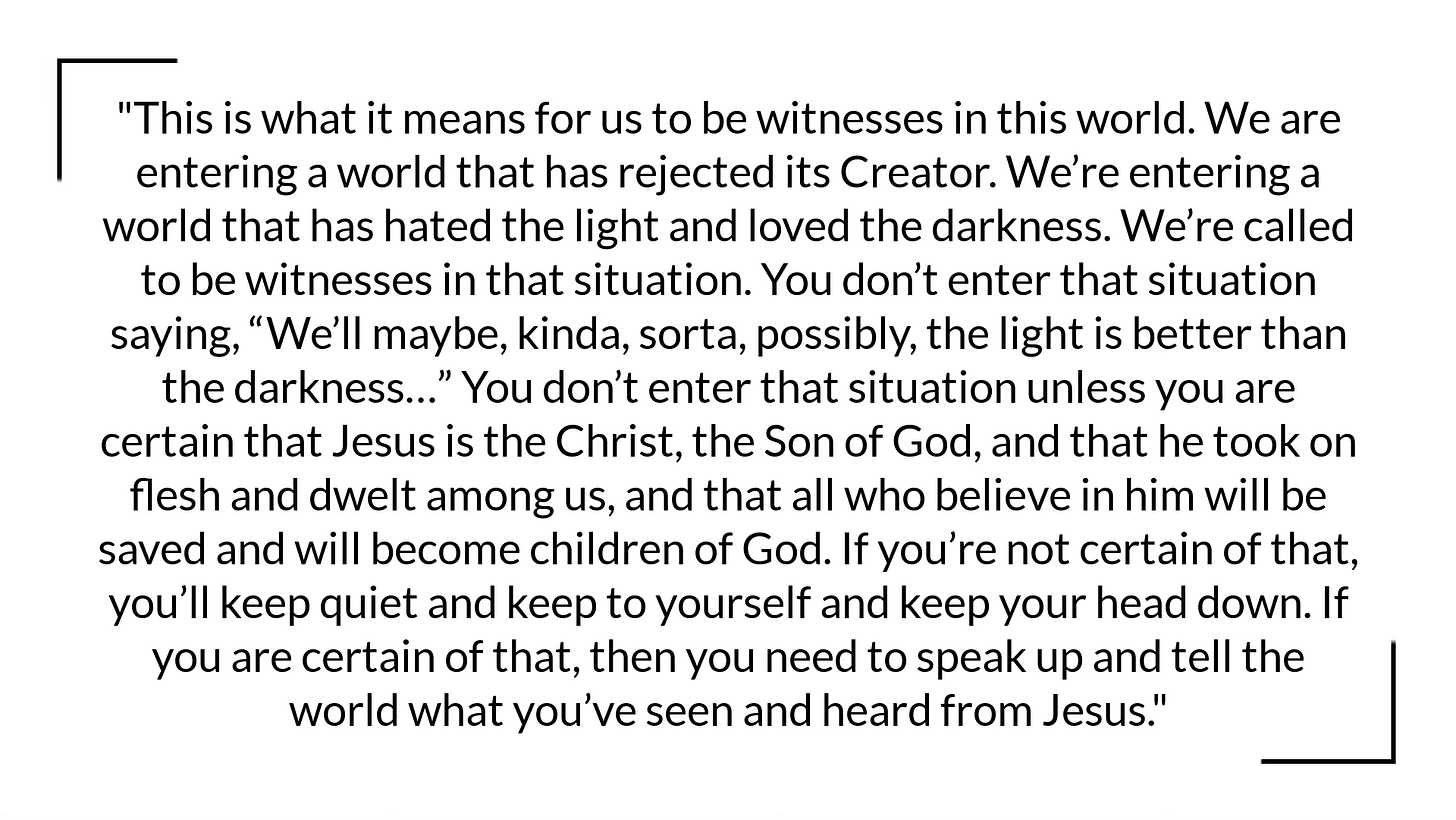 This is what it means for us to be witnesses in this world. We are entering a world that has rejected its Creator. We’re entering a world that has hated the light and loved the darkness. We’re called to be witnesses in that situation. You don’t enter that situation saying, “We’ll maybe, kinda, sorta, possibly, the light is better than the darkness…” You don’t enter that situation unless you are certain that Jesus is the Christ, the Son of God, and that he took on flesh and dwelt among us, and that all who believe in him will be saved and will become children of God. If you’re not certain of that, you’ll keep quiet and keep to yourself and keep your head down. If you are certain of that, then you need to speak up and tell the world what you’ve seen and heard from Jesus. You have to be a witness in the world because you’re certain that it is true. You know it. We need that level of certainty and confidence if we’re ever going to have an effective and unashamed witness in the world.